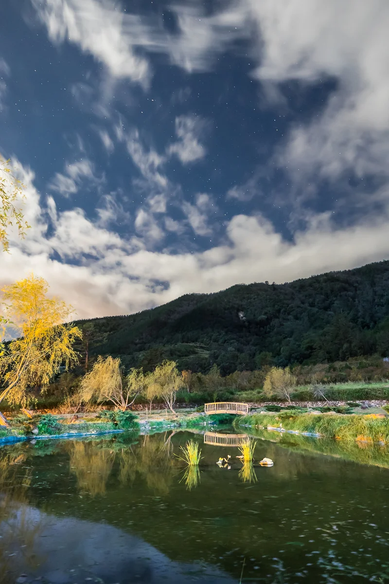 算好銀河出現的時辰和方位,忘記月亮也剛好從東方升起,只好利用月光長曝照亮湖面與星空。仔細看天蠍座就在山頂上。