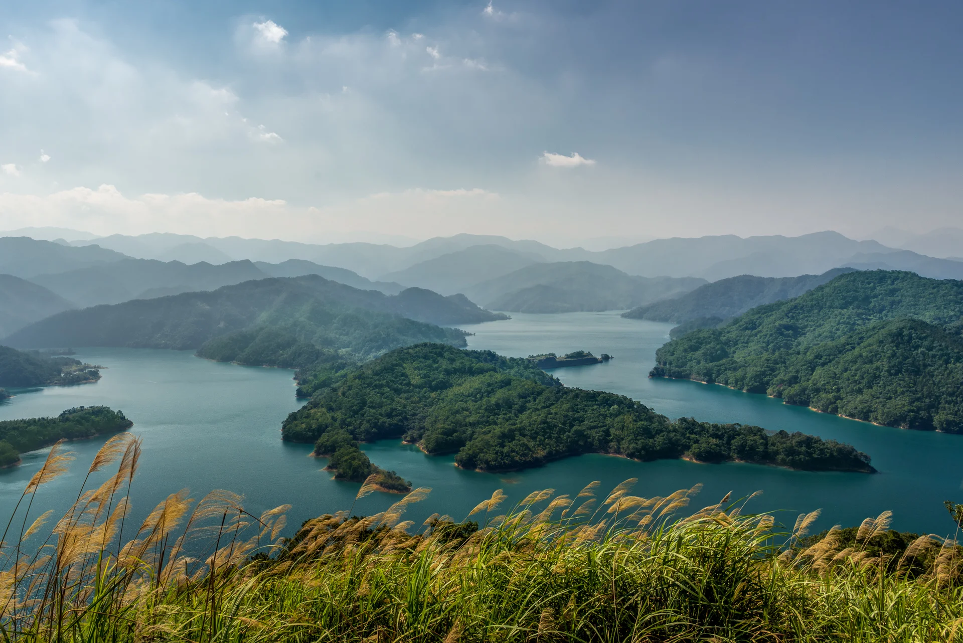 來訪千島湖多次,終於找到這個最佳觀景點。是個開闊視野可鳥瞰兩個主要潭面-鴛鴦潭(右側)上接北勢溪;鯉魚潭(左側)下接翡翠水庫。這個景點不太容易找得到,需徒步延著土路穿越樹林(20分鍾)到獅頭山再續行約15分鐘通過樹林來到這個開闊空間。這次拍攝時間近中午(最爛的時段)光線反差太大霧氣又瀰漫遠處湖面。
