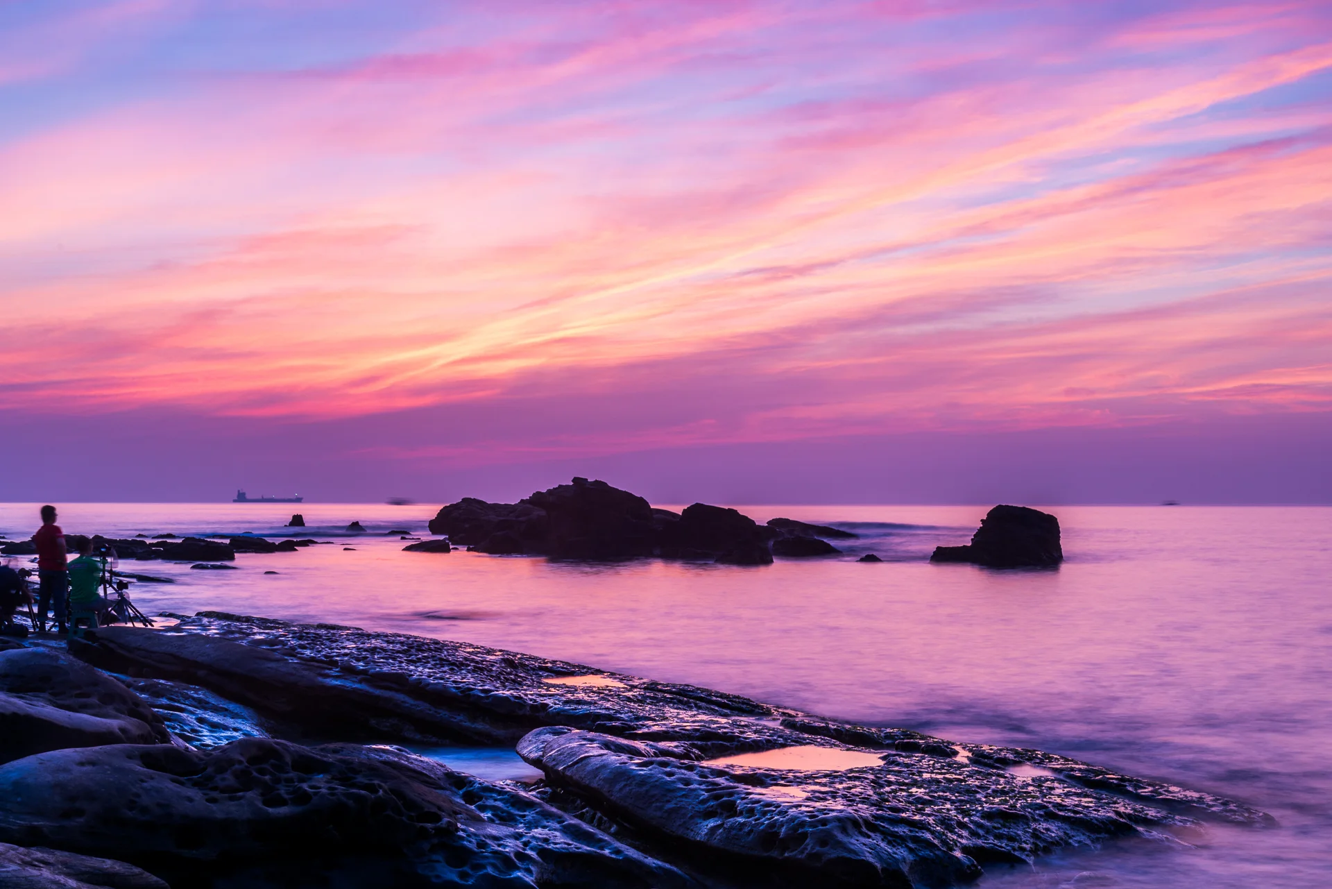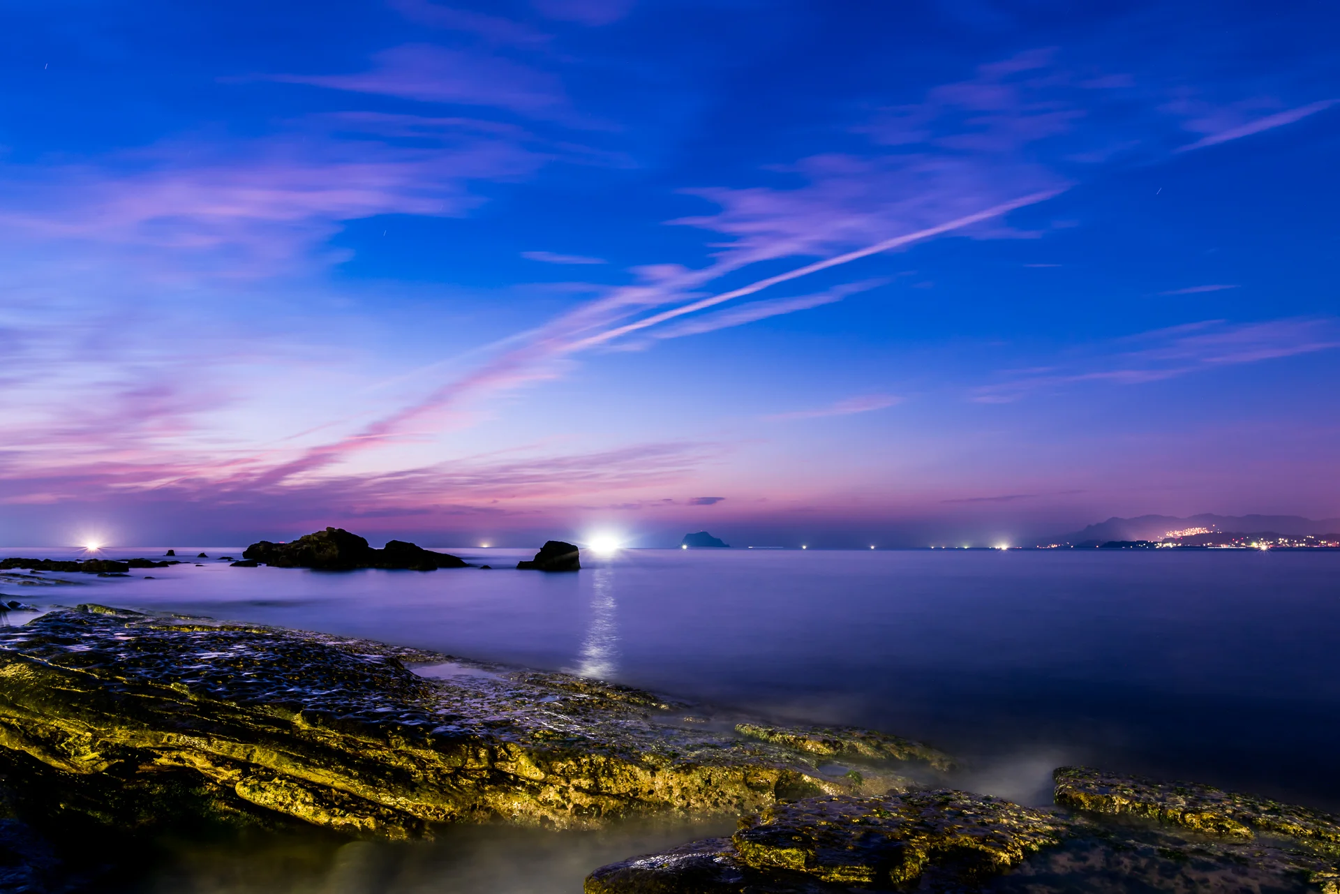 日出40分鐘前(4:24AM)的藍調天空與遠處漁船燈火,預測天際邊橘紅色色溫就是火燒雲的前兆。畫面右方是基隆外木山-另一個北海岸熱門日出景點!