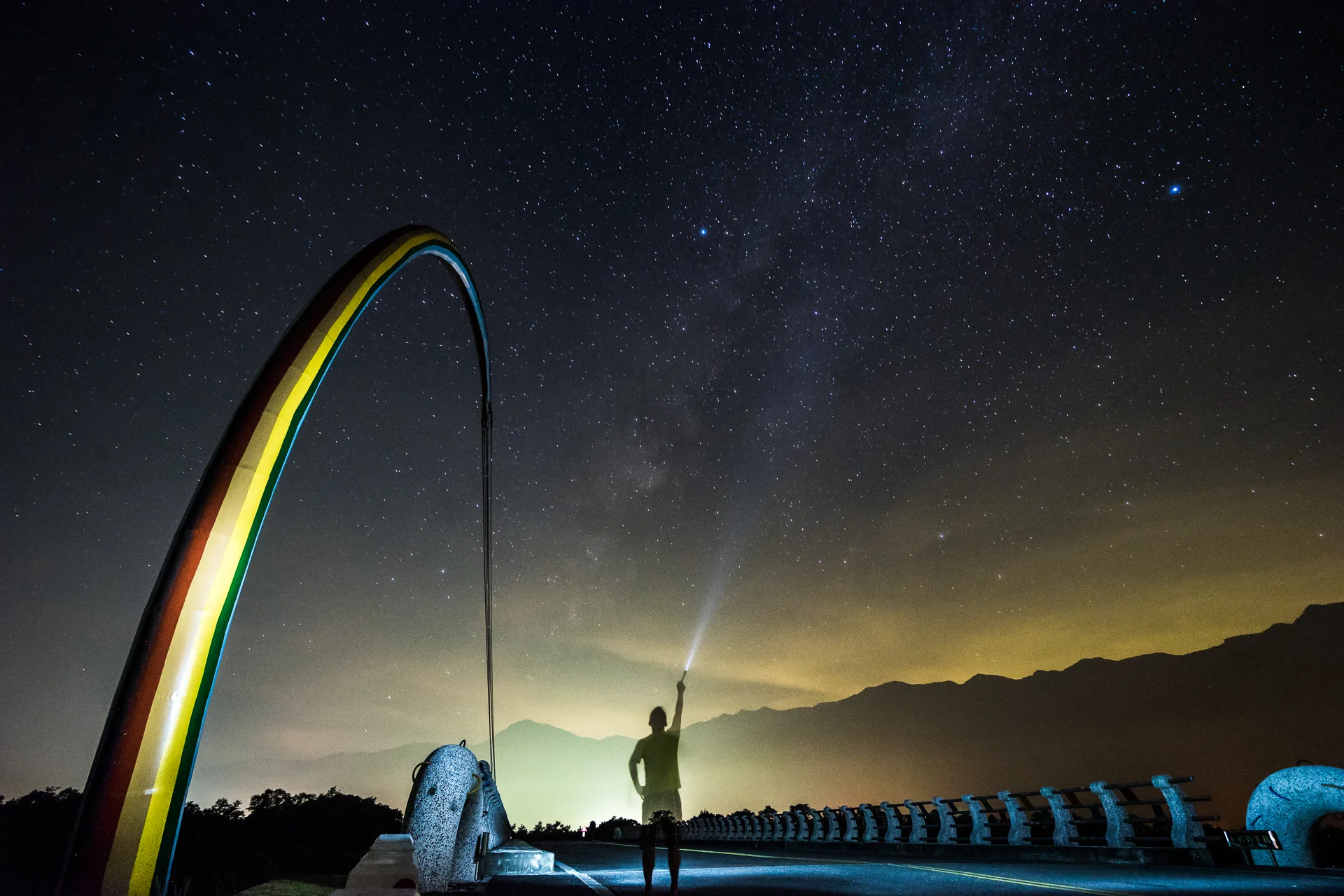 「2015-06-28 @花蓮光復」 平地也拍得到銀河!凌晨3點獨自開車從光復營地出發到大豐大富平地森林,途中經過釣竿橋往西南方天空仰望,銀河下半段還未沒入地平線。釣竿橋當前景,曝光期間拿著手電筒照亮釣竿及橋面,索性也把自己入鏡。平地森林在光復的南方往南方數公里幾乎沒有住家及路燈的光害,南邊最亮的部分應該是四十多公里外的玉里鎮的燈光。中景是中央山脈。