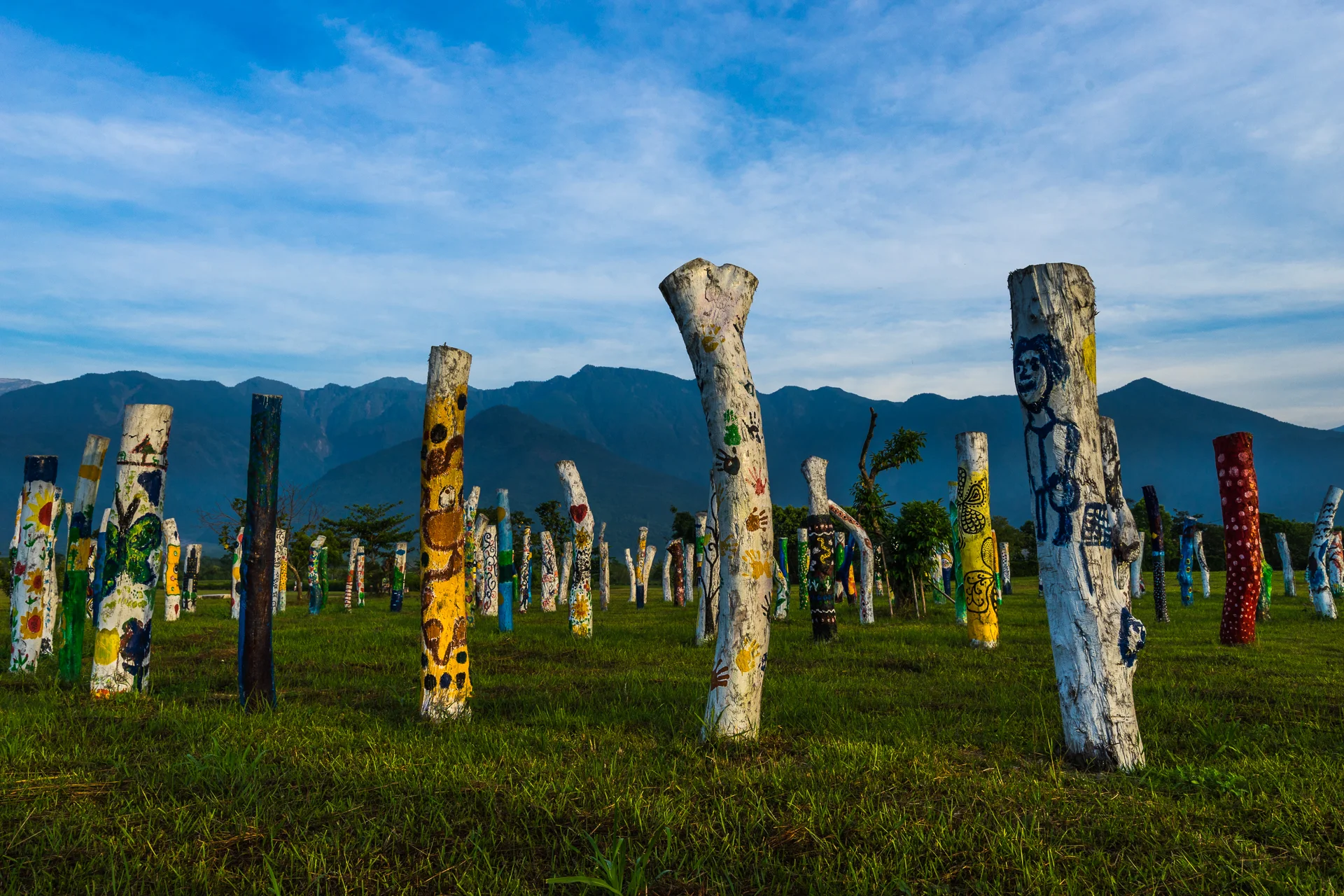 藝術家在木頭上彩繪原住民圖騰,木頭排列有點像位在英國 Wiltshire 的Stone Hedge,同樣是同心圓排列,我們有中央山脈當背景,美的角度不同!