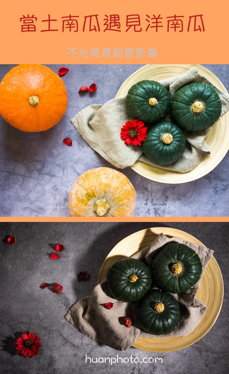 當土南瓜遇見洋南瓜 May 16 Written By 江煥華 Huan Hua Chiang 還沒想好怎麼料理它們就先拍個定裝照!以高光和低光可以拍出不同的調性! 江煥華 Huan Hua Chiang https://huanphoto.com