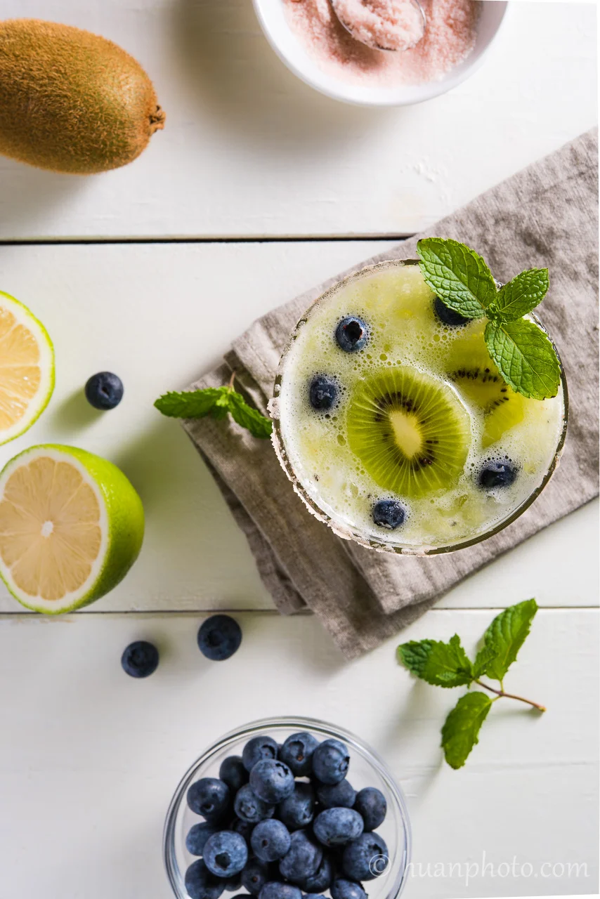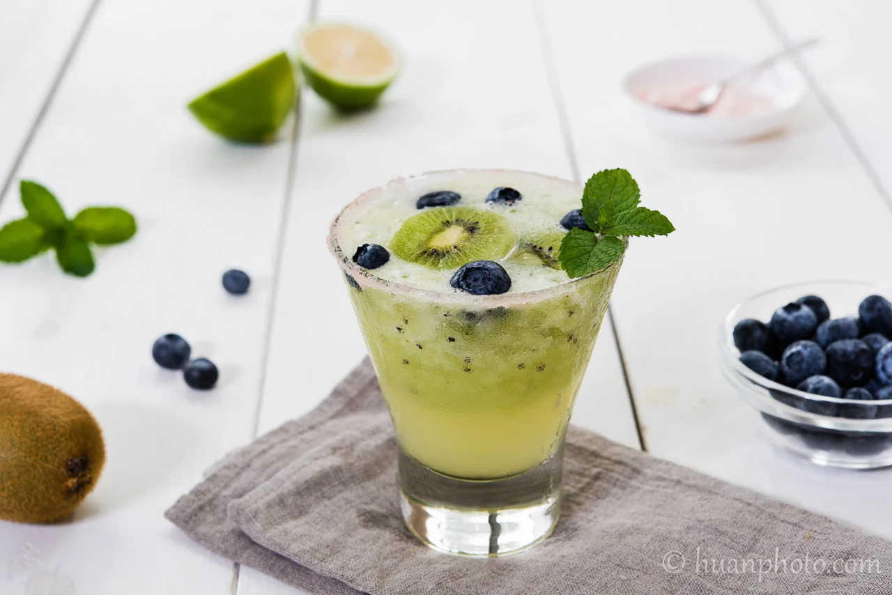 藍莓奇異果冰沙瑪格麗特 Jul 17 Written By 江煥華 Huan Hua Chiang 夏日午後清涼飲品-自創藍莓奇異果冰沙瑪格麗特,冰鎮後的藍莓變得鮮脆爽口,真的好喝! silver tequila 30ml 橙酒 15ml 萊姆糖漿少許 奇異果一顆 檸檬汁 30ml 冰塊 1/3 杯 雞尾酒杯口以檸檬片沾溼,延杯口沾少許鹽巴 所有材料用果汁機慢速打碎約10秒 倒入酒杯,藍莓&奇異果切片點綴 View fullsize 江煥華 Huan Hua Chiang https://huanphoto.com