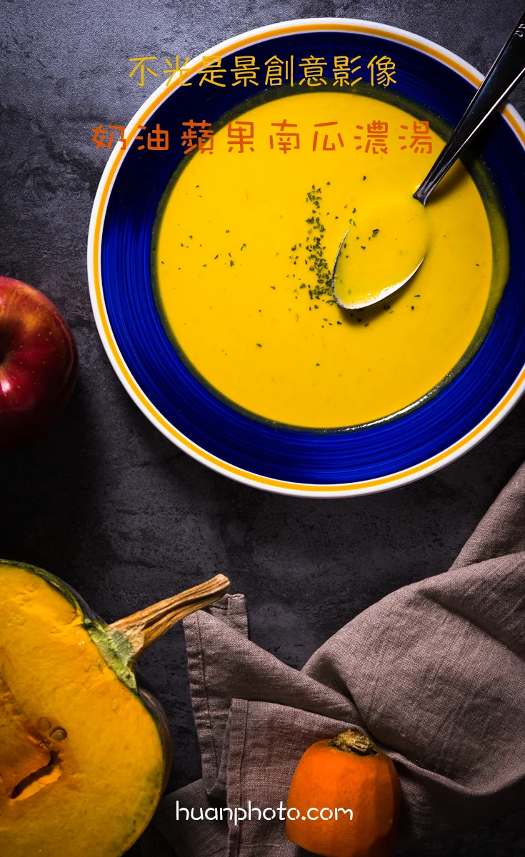 造型以對比色希臘藍搭配鮮黃濃湯,左下角以主要食材用來陪襯濃湯主角,整體佈光以水泥暗色背景加灰色桌巾凸顯紅黃色主角。