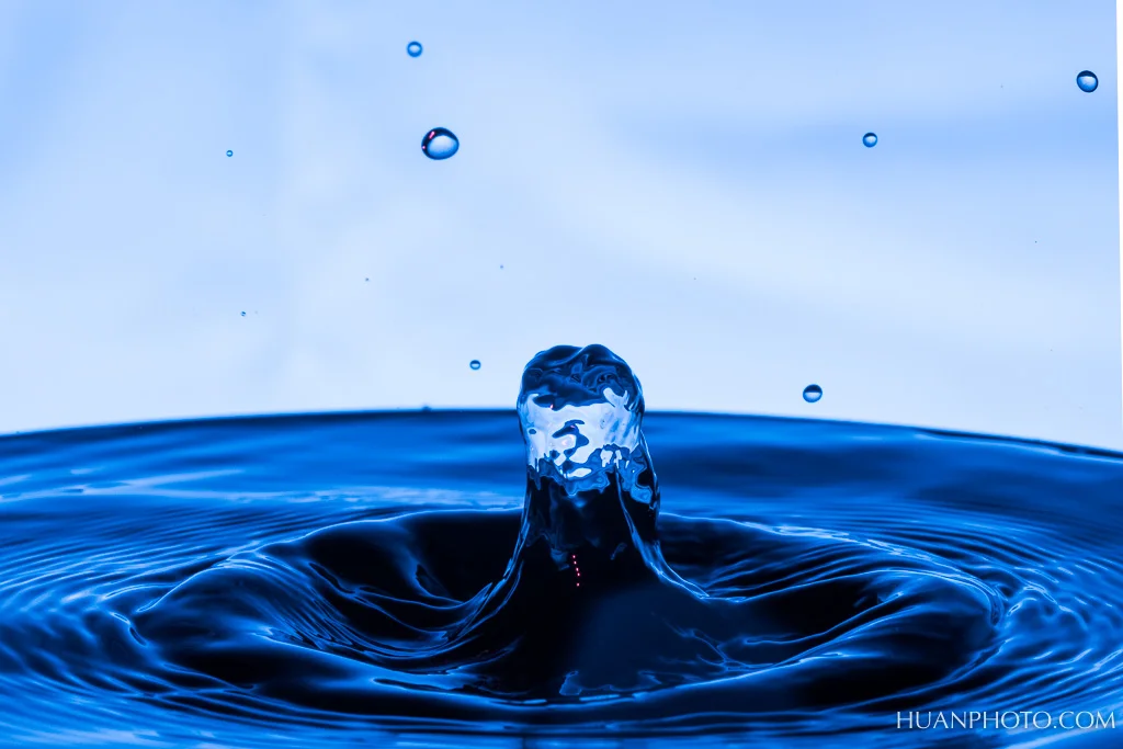使用機頂閃燈觸發白色背景布下方的SB-900閃燈(TTL+1.3出力), 機頂閃燈前面黏一小片紅色透明紙,機頂閃燈設定出力1/16足以使水滴產生紅色亮點,對應於整體偏冷的藍色調。