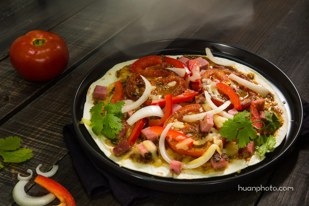 - 餅皮塗抹鴨肉醬、起司絲、蕃茄、紅椒、煙燻里肌、洋蔥、上面再撒起司絲