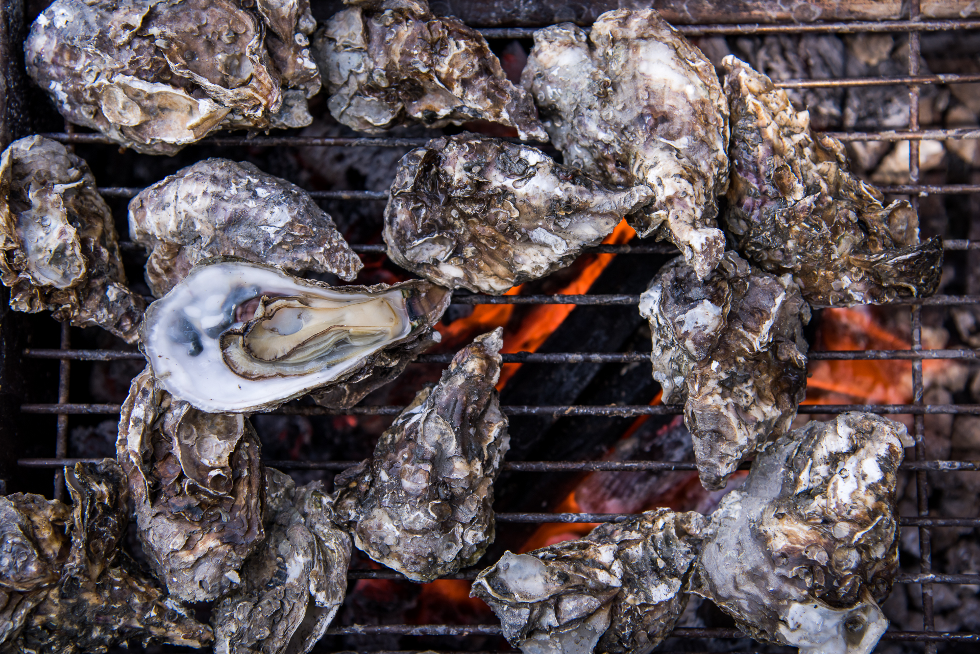 海牛老闆採了兩串牡蠣,就在牡蠣海田邊烤邊聊天。這樣的牡蠣賣到涵碧樓一顆台幣150,賺到了!